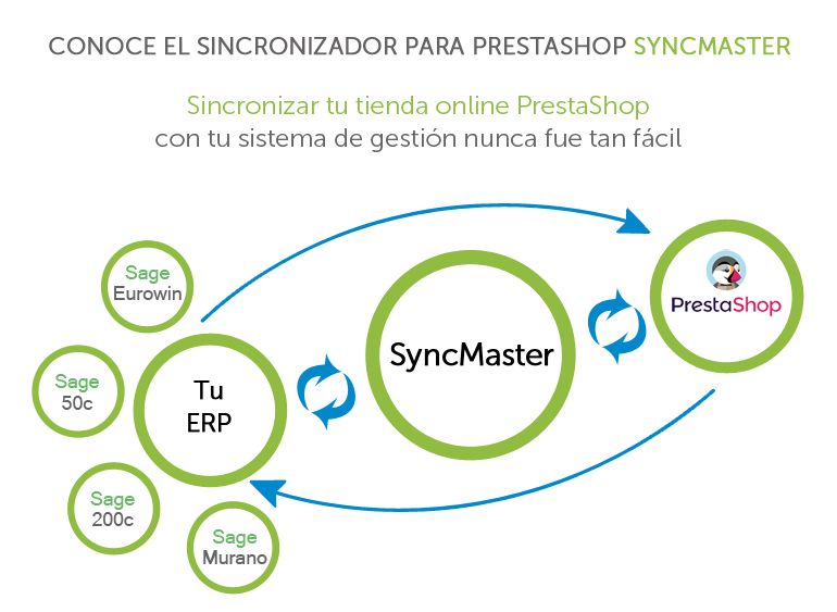 Os presentamos SyncMaster, una aplicación que permite sincronizar tu tienda online de PrestaShop con los ERP de Sage: Sage Eurowin, Sage 50c, Sage 200c y Sage Murano de la manera más fácil. Además, también permite sincronizar con los principales marketplaces como Amazon, Ebay, entre otros.