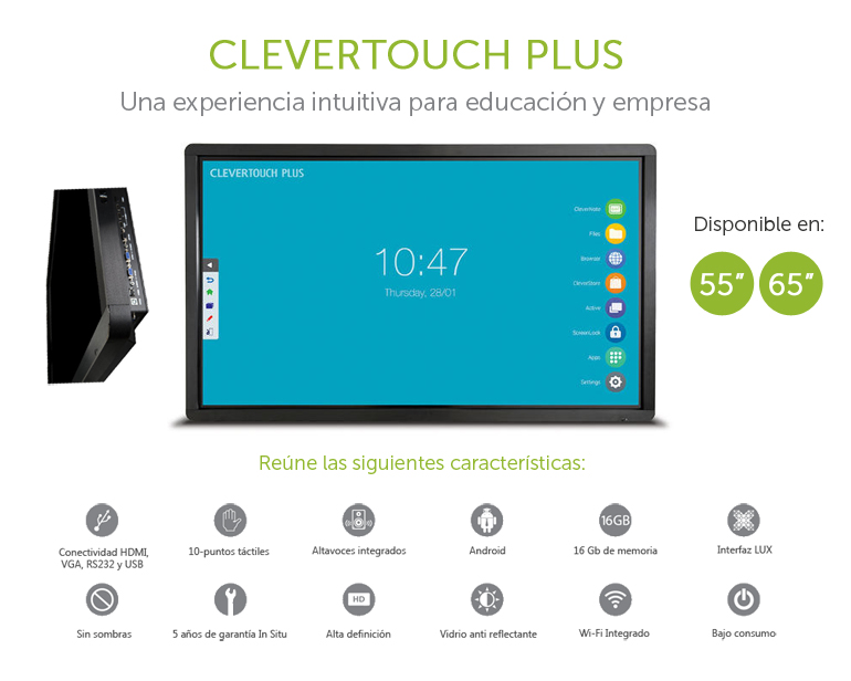 Clevertouch Plus ha sido premiado como el mejor monitor interactivo del año en Simo Educación 2016 constituyendo uno de los mejores recursos, soluciones y experiencias TIC para el sector educativo. La pantalla destaca por la rica e innovadora tecnología con la que está construida. Dispone de 10 puntos táctiles simultáneos, una resolución Full HD 1080p y tiene conexiones HDMI, VGA, RS232 y USB. Su utilización en las aulas está reemplazando a las pizarras tradicionales ya que el monitor trabaja como pizarra interactiva y permite escribir notas, insertar imágenes, hacer diagramas, añadir y moverse por las diferentes páginas como si de un PC se tratase y también permite explorar internet usando el navegador integrado. Poseen software Android y es compatible con Mac, iOS, Android y Linux.