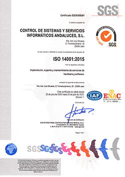 También SGS, concede a Controlsys la certificación en el cumplimiento de la norma ISO 14001: 2015, referente al Sistema de Gestión Medioambiental, que se otorga a las empresas que gestionan de una manera eficiente su impacto medioambiental, implantando medidas de control que reduzcan la contaminación, para minimizar su impacto en el entorno.