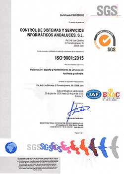 Controlsys, en su filosofía de mejorar la calidad de sus servicios, ha conseguido la certificación correspondiente al Sistema de Gestión de la Calidad, ISO 9001: 2015, otorgado por SGS, reconociéndose así que cumple con los requisitos de dicha norma para la Implantación, soporte y mantenimiento de servicios de hardware y software.